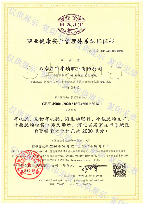 石家莊市豐碩肥業有限公司是一家集新型肥料的研發、制造、營銷、服務于一體的高新技術企業,公司自2008年創辦以來,一直致力于新型肥料的技術研發和市場推廣。公司組建了豐碩新型肥料研究中心(院士專家企業工作站),自主知識產權研發團隊專業科研人員20余人,獲得了多項肥料國家發明專利。公司目前已擁有發酵類有機肥、微生物菌劑、生物有機肥、土壤調理劑、大量元素水溶肥、含腐植酸肥料、含氨基酸肥料、中微量元素肥料等8大品類,“金維克”、“豐碩沃農”等2大自有品牌,擁有20多個暢銷品種。目前,我公司已經通過了“ISO9001 質量管理體系認證”、“ISO14001 環境管理體系認證”、“OHSAS18001 職業健康管理體系認證”。...